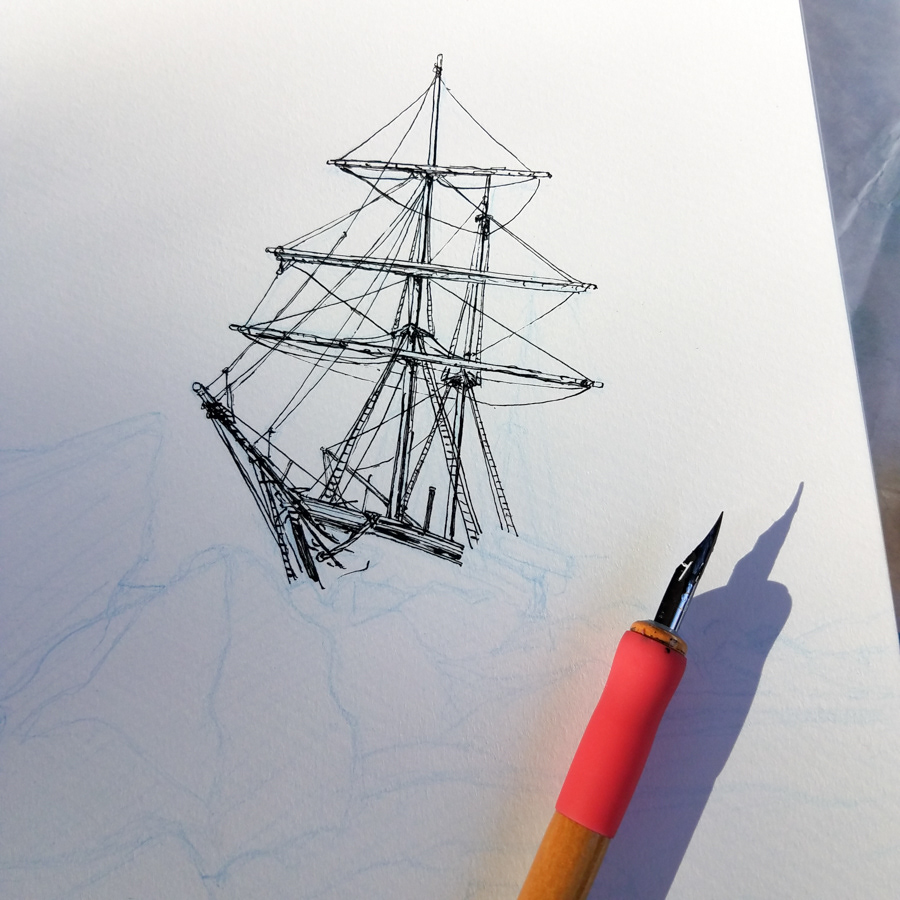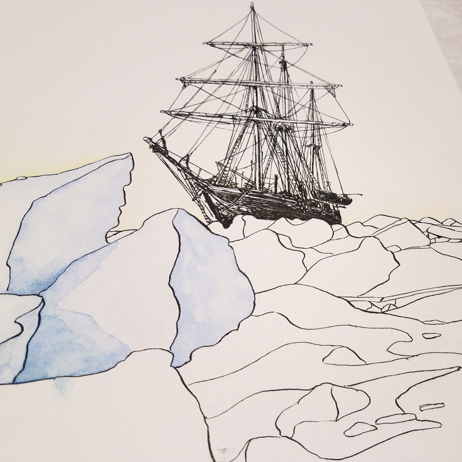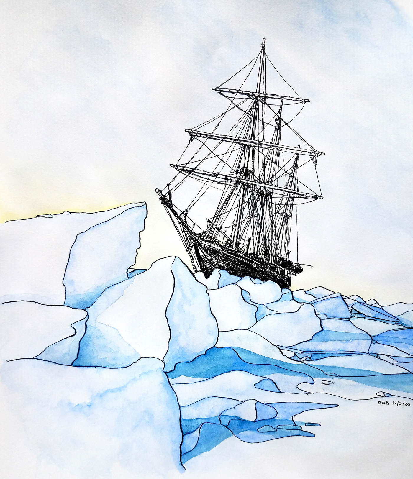 (By endurance we conquer) Part 6 of my personal work "What would Shackleton do?" series on democracy to commemorate the 2020 presidential election results on November 7th. Ink and nib pen with watercolor on paper.