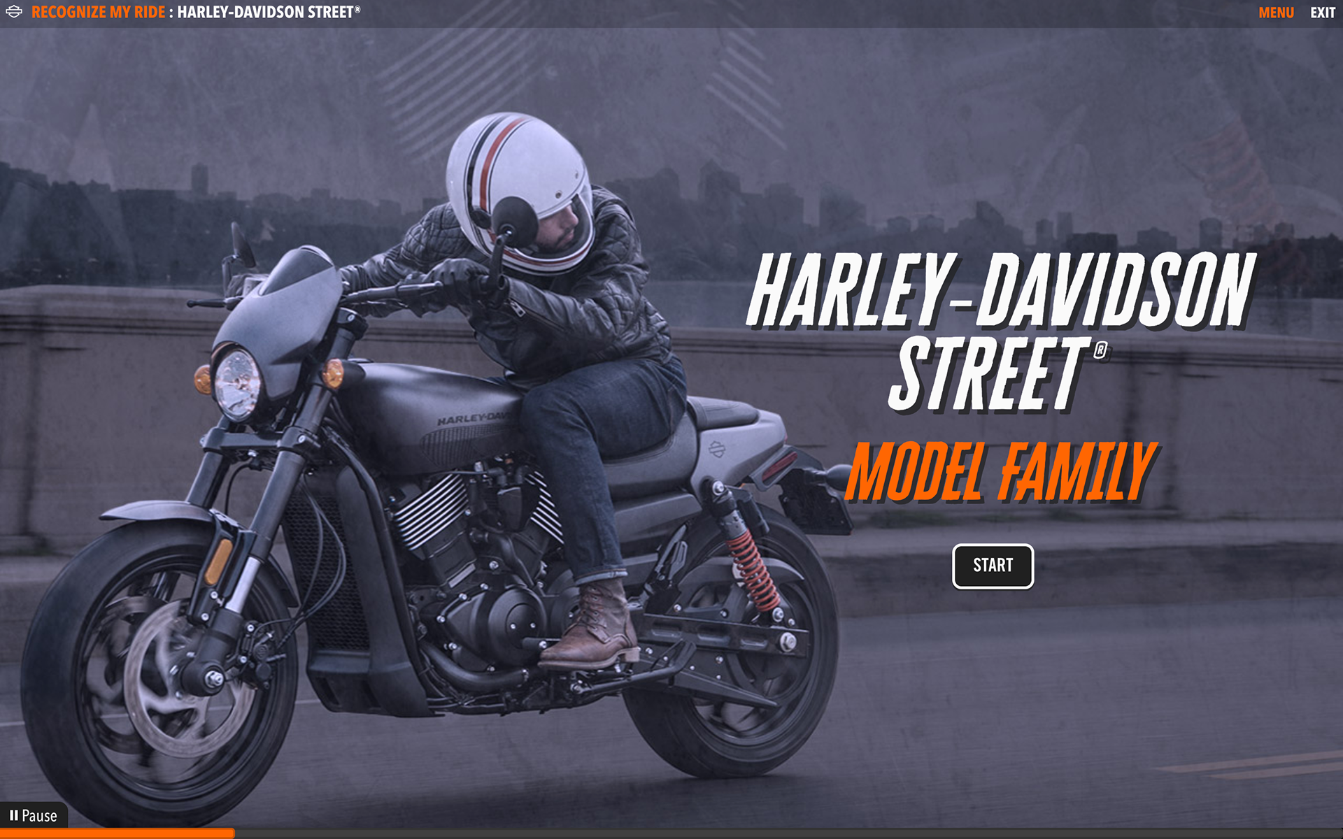 Computer-based training course for employee audiences. Intended to train and educate on the model family differences between motorcycles and help identify a bike easily when spotted on the road, at work, or on the dealership floor. Provided art direction, instructional design, ux design, script writing, graphic design, project management, and development of online course package. Interactive content, unconventional image crops and unified graphic treatments, along with engaging music aided this course in higher than normal interaction rates, and made it a huge success increasing product knowledge and engagement across all levels of the corporation.